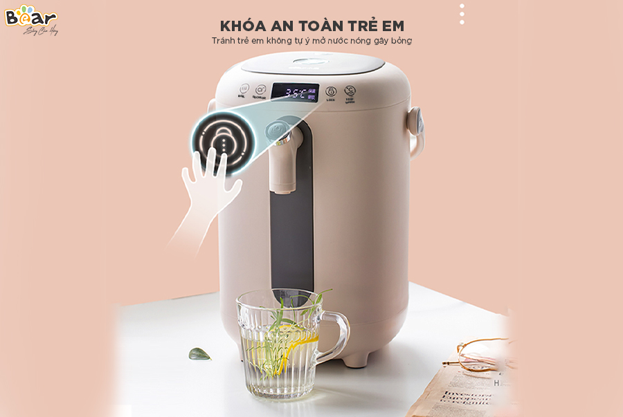 Bình thủy điện 3L Bear đảm bảo an toàn cho người sử dụng với lớp vỏ bình được sơn cách nhiệt, cách điện hoàn hảo cùng phần ruột bình được làm từ inox 304 chống han gỉ, không mùi, giữ nhiệt tốt. Bên cạnh đó, bình thủy điện 3L Bear còn có khóa an toàn cho trẻ em, giúp bạn hoàn toàn an tâm khi sử dụng bình và có thể tránh tuyệt đối tình trạng bé bị bỏng do nghịch nước. Để khởi động khóa này, bạn chỉ cần ấn nút khóa an toàn trên thân bình, từ đó, vòi sẽ tự động khóa và không cho lấy nước.