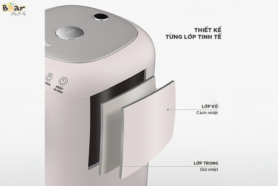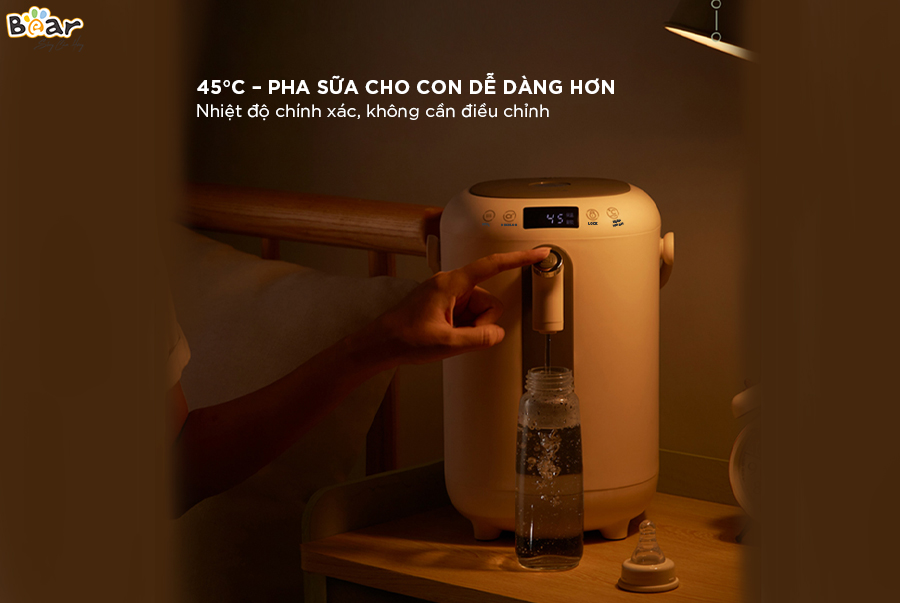 - Bạn có con nhỏ và đang cho bé uống sữa ngoại, sữa công thức? Để đảm bảo được hàm lượng các chất dinh dưỡng của sữa công thức sau khi pha, chắc chắn, bạn sẽ cần chú ý đến nhiệt độ của nước pha. Tuy nhiên, không phải loại sữa công thức nào cũng có nhiệt độ nước pha giống nhau. Do đó, trước khi pha sữa cho con, bạn cần xác định đúng nhiệt độ của nước pha để chất lượng sữa đạt chuẩn nhất. Nếu như thông thường, bạn thường dùng nhiệt kế để đo nhiệt độ nước pha thì giờ đây, chỉ cần một nút bấm duy nhất trên bình thủy điện Bear 3L, bạn đã có thể cài đặt mức nhiệt như ý. Với bình thủy điện Bear 3L, bạn có thể pha được đa dạng các loại sữa cho con mà không cần lo lắng về việc chuẩn bị lách cách nhiều đồ dùng, vật dụng mỗi lần pha sữa.