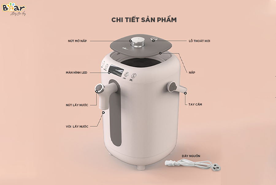 Bình thủy điện 3L Bear có dung tích lớn, thiết kế nhỏ gọn, màu sắc nhã nhặn, sang trọng