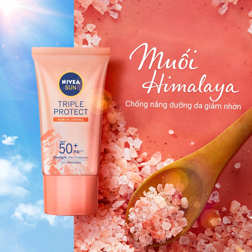 Kem Chống Nắng Nivea Triple Protect Acne Oil Control SPF50+ PA+++ 40ml là dòng kem chống nắng đến từ thương hiệu mỹ phẩm Nivea thuộc tập đoàn Beiersdorf của Đức, với công nghệ Triple Defense cùng chỉ số chống nắng SPF50+ PA+++ giúp chống nắng tối ưu bảo vệ da dưới tia UVA, UVB, ánh sáng xanh và ô nhiễm từ môi trường. Đồng thời sản phẩm sử dụng công thức Ultra Light cho lớp chống nắng thẩm thấu nhanh vào da, không gây cảm giác nhờn rít.