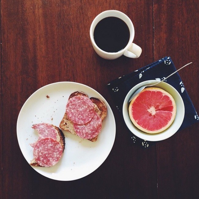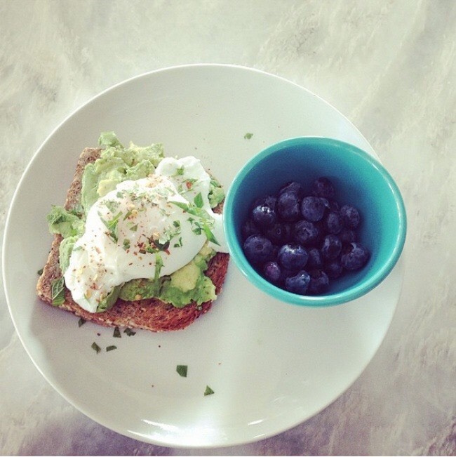 Thực đơn này bao gồm bánh mỳ nướng, bơ xay nhuyễn, trứng tráng, rắc cùng ít rau xanh và bột ớt đỏ. Tráng miệng với quả việt quất - một trong những loại quả chứa chất chống oxy hoá dồi dào, và ớt đỏ giúp kích thích hệ tuần hoàn.