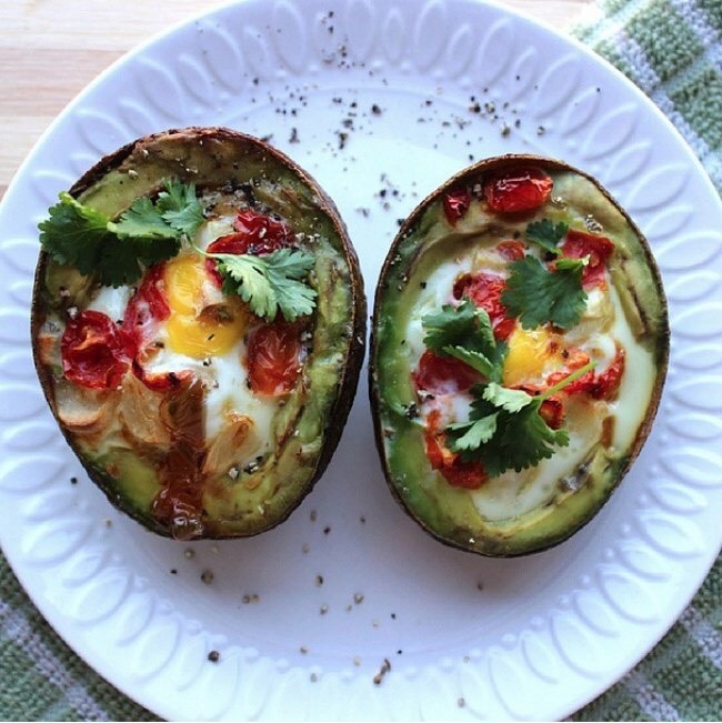 Cách làm: Làm nóng lò nướng ở nhiệt độ 200°C. Cắt quả bơ ra làm 2 phần, bỏ hạt, sau đó đập trứng và đổ vào mỗi nửa quả bơ. Thêm cà chua, tiêu, muối vừa miệng. Rắc rau thơm trang trí và tạo hương vị. Cuối cùng nướng bơ trứng trong thời gian 20-25 phút là bạn đã có bữa sáng vừa ngon miệng lại vừa đủ chất.