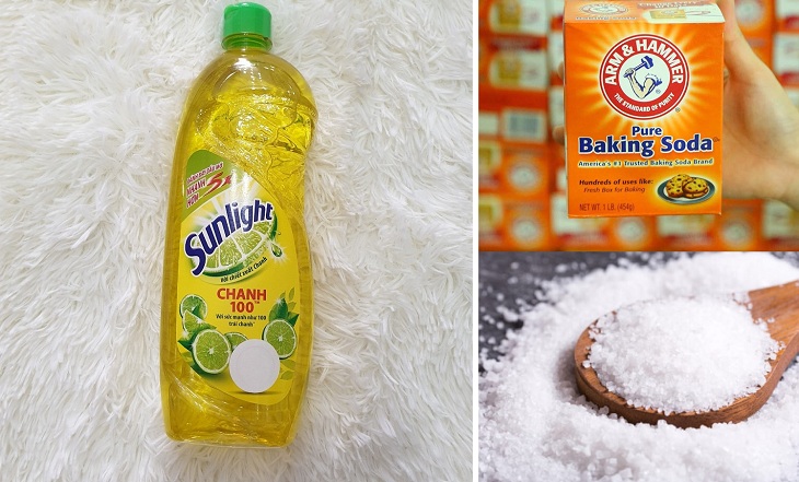 Bước 1: Trước tiên cho 3 muỗng canh muối ăn, 2 muỗng canh baking soda, vài giọt nước rửa chén và 500ml nước sôi vào một cái thau. Sau đó, hãy khuấy đều cho các nguyên liệu hòa tan.
